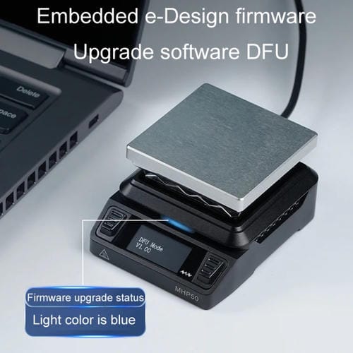 • Potencia de calentamiento: 150 W (DC5525) / 100 W (PD); Pantalla LCD en color con resolución 160 x 80; área de calentamiento de 50 x 50 mm; estabilidad térmica de +/- 3%; tamaño consola 71,5 x 55,5 x 22,5 mm; calentador 50 x 50 x 29 mm; peso consola 78 g, calentador 87 g; interfaz USB tipo C y DC5525; control inteligente de temperatura con función de simulación de horno de reflujo; sistema de seguridad con detección de inclinación que detiene el calentamiento.
