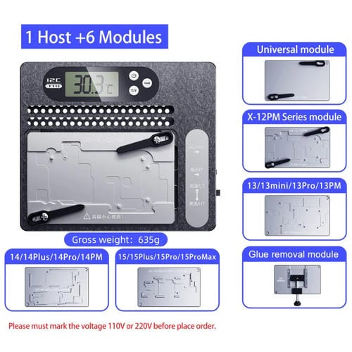 La estación de desoldar en capas T18 con Pantalla LCD i2C es una plataforma de Reparación diseñada para la manipulación precisa de Placas Base PCB de modelos iPhone desde el X hasta el 15 Pro Max. Esta Herramienta profesional permite la separación y unión eficiente de Placas Base, así como la eliminación de pegamento en chips de CPU, optimizando procesos de Reparación electrónica. Su diseño modular magnético facilita el cambio de módulos para adaptarse a diversas tareas, mientras que su control de temperatura constante, que varía entre 180 y 245 grados Celsius, garantiza un desoldado seguro y efectivo. Fabricada en aluminio de aviación con procesamiento CNC, esta estación ofrece resistencia a altas temperaturas y oxidación, asegurando durabilidad y precisión en aplicaciones Técnicas especializadas.