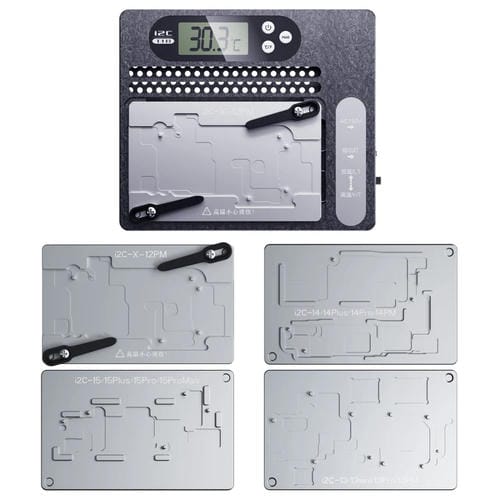 La estación de desoldar con Placa Base PCB y Pantalla LCD I2C modelo T18 es una plataforma profesional diseñada para la Reparación y mantenimiento de Placas Base de dispositivos iPhone desde el modelo X hasta el 15 Pro Max. Compatible con Enchufe USA, esta estación permite la separación y unión precisa de Placas Base mediante un sistema modular magnético que asegura un control térmico constante y seguro. Equipado con una Pantalla Digital LED de alta definición, ofrece un rango de temperatura ajustable desde 180 hasta 245 grados Celsius, facilitando la eliminación de pegamento y residuos de estaño en chips y CPU. Su construcción en aluminio de aviación con procesamiento CNC garantiza resistencia a altas temperaturas y durabilidad, siendo apta para usuarios que reparan por cuenta propia y Técnicos especializados en electrónica de precisión.