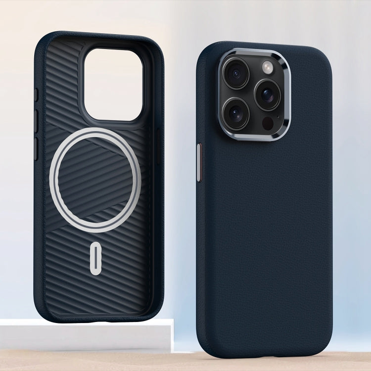 Funda de teléfono iPhone 13 Pro Marco de Lente de metal Magsafe de cuero a prueba de golpes (Azul)