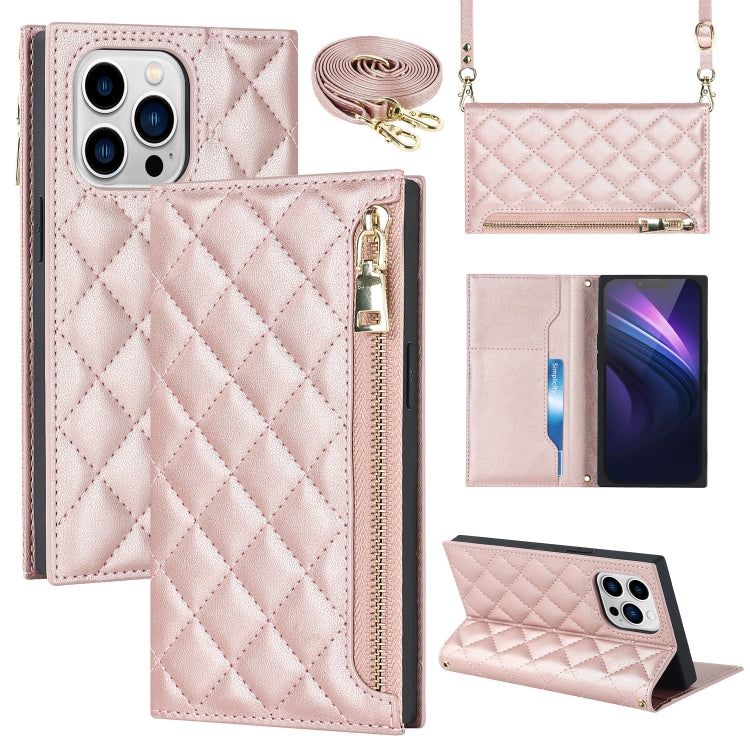 Funda de Cuero con Cremallera para iPhone 13 Pro Grid Texture Lanyard (Oro Rosa)