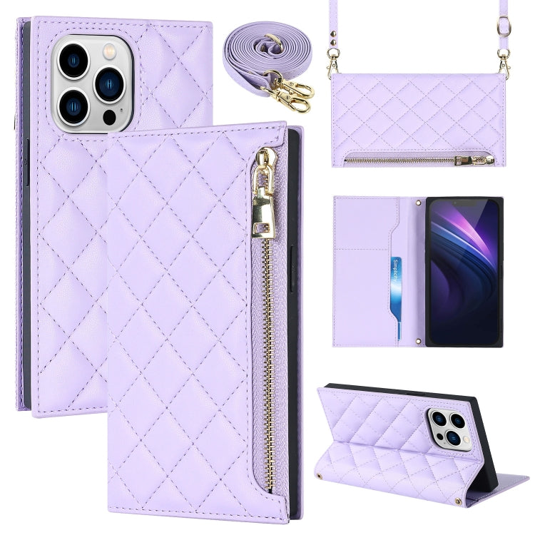 Funda de Cuero con Cremallera para iPhone 13 Pro Grid Texture (Púrpura)