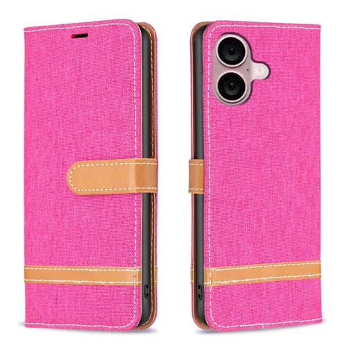 Funda para Teléfono iPhone 16 Cuero Textura Vaquera Bloques de Color (Rojo Rosa)