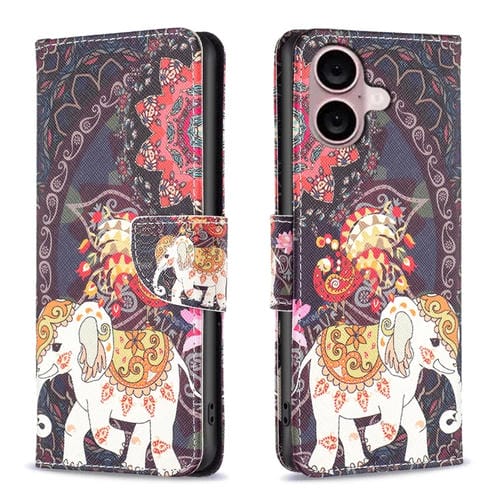 Funda de Cuero para iPhone 16 con Tapa y Patrón de Dibujo de Colores (Elefante)