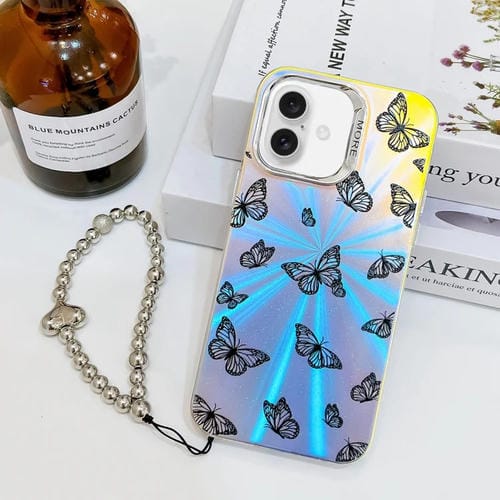 Funda para Teléfono iPhone 16 Mariposa Láser Galvanizada con Correa para Muñeca (Negro)