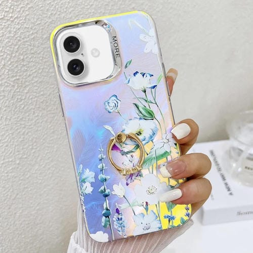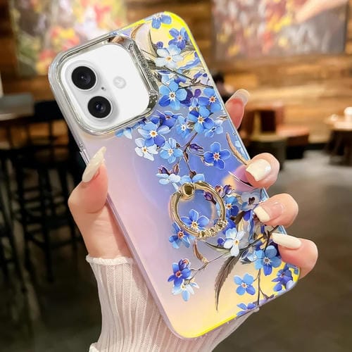 Caja de Teléfono TPU para iPhone 16 con Soporte de Anillo y Flor Láser de Galvanoplastia (Myosotis Ah2)