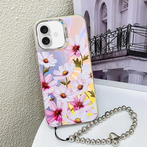 Funda para Teléfono iPhone 16 Cosmos Flower Ah7 con Flor Láser Galvanizada y Correa para la Muñeca