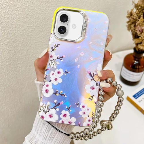 Funda para Teléfono iPhone 16 Pear Blossom Ah17 Flor Láser Galvanizada con Correa para Muñeca