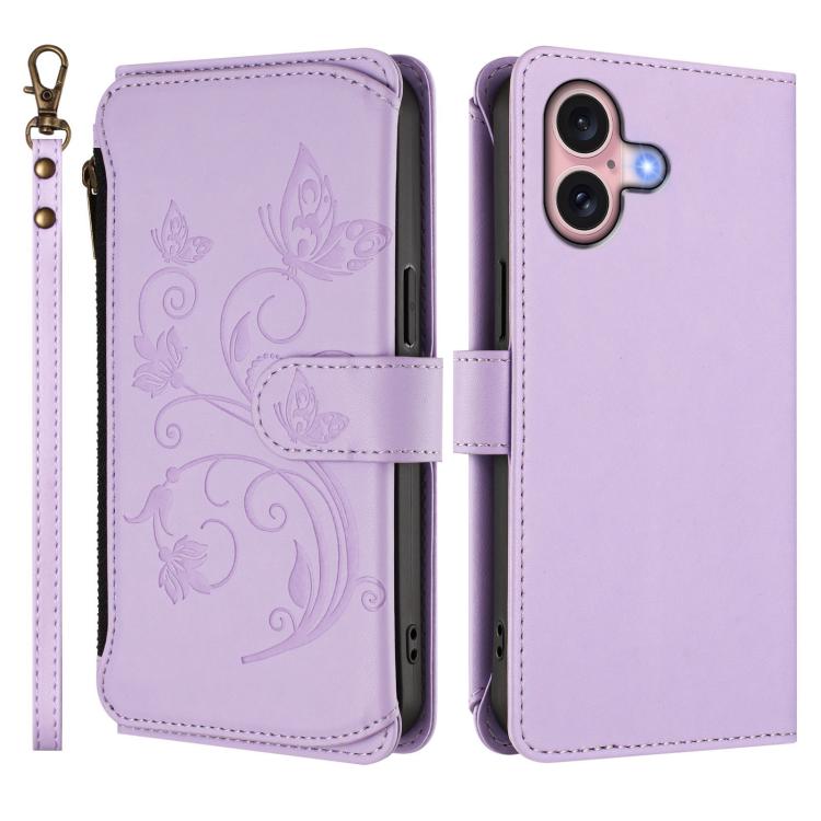 Funda de cuero con cremallera para iPhone 16, diseño de mariposas, flores y amor (morado claro)
