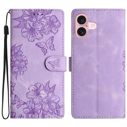 Funda para Teléfono iPhone 16 PU Sensación de Piel Mariposa y Flor de Cerezo En Relieve (Púrpura)