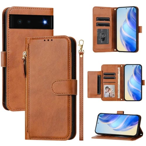 Funda de Cuero con Cremallera y Ranuras para Tarjetas para Google Pixel 6 (Marrón)