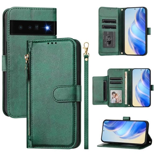 Funda de Cuero con Cremallera y Ranuras para Tarjetas para Google Pixel 6 Pro (Verde)