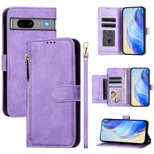 Funda de Cuero con Cremallera y Ranuras para Tarjetas para Google Pixel 7A (Morado)