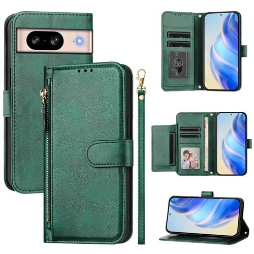 Funda de Cuero con Cremallera y Ranuras para Tarjetas para Google Pixel 8 (Verde)