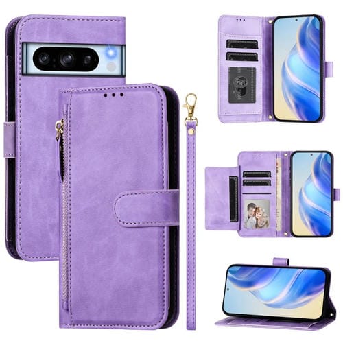 Funda de Cuero con Cremallera y Ranuras para Tarjetas para Google Pixel 8 Pro (Morado)