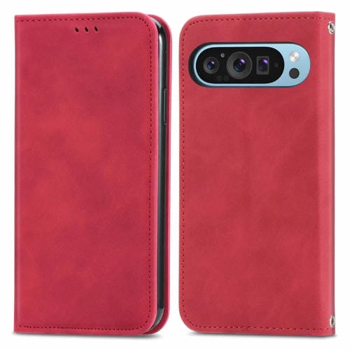 Funda de Cuero con Tapa Magnética y Tacto Retro para Google Pixel 9 Pro XL (Rojo)
