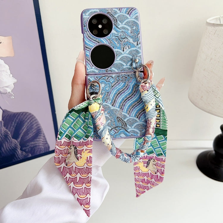 Funda para Teléfono Huawei P50 Pocket Bordado Nubes Cobertura Total con Bufanda y Pulsera (Verde)