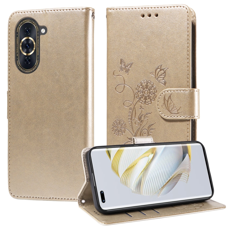 Funda de Cuero Huawei Nova 10 Pro con Diseño de Mariposas y Flores en Relieve (Dorada)