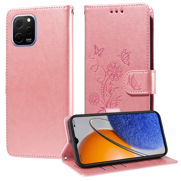 Funda de Cuero para Huawei Nova Y70 Plus con Diseño de Mariposas y Flores en Relieve (Oro Rosa)