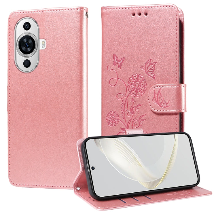 Funda de Cuero Huawei Nova 10 Pro con Diseño de Mariposas y Flores en Relieve (Oro Rosa)