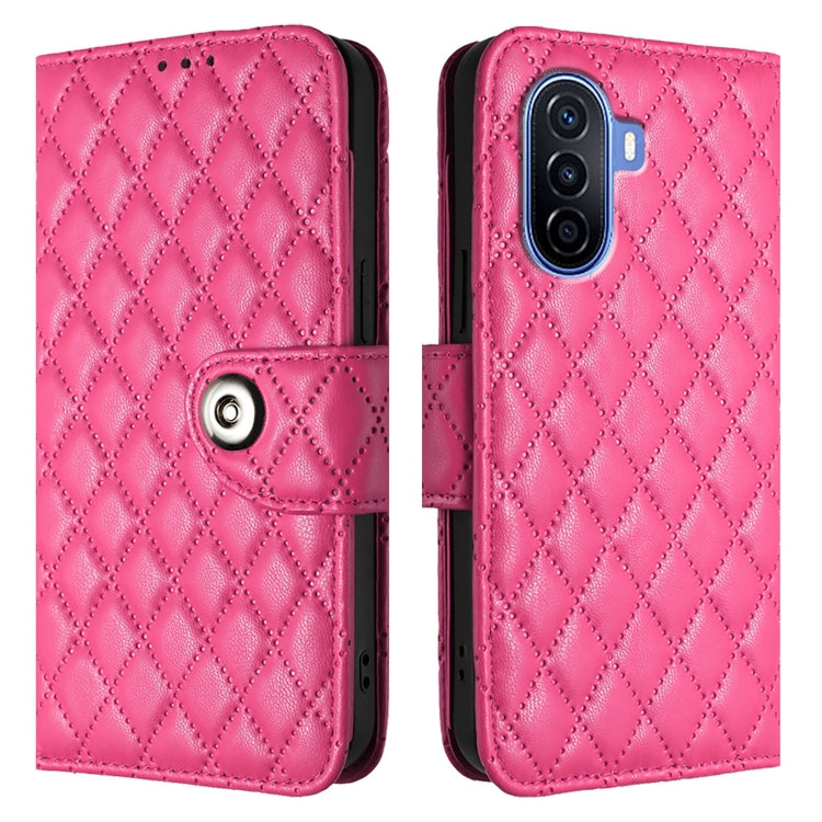 Funda para Huawei Enjoy 50 y Nova Y70 Plus con Tapa de Cuero y Textura Rómbica (Rojo Rosa)