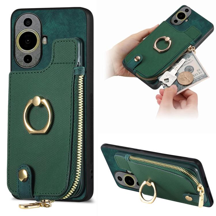 Funda para Teléfono Huawei Nova 11 con Cremallera Vertical y Anillo de Cuero Cruzado (Verde)