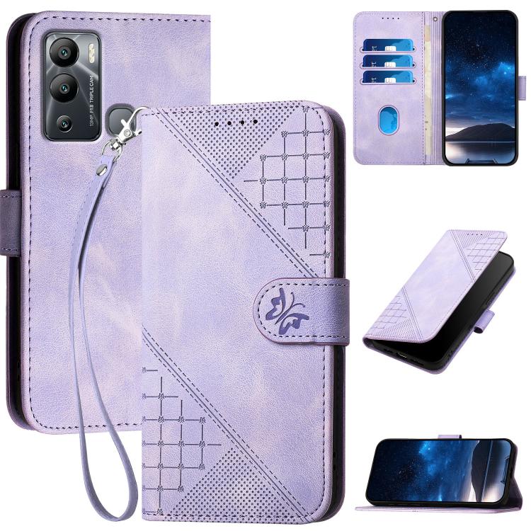 Funda de Cuero para Infinix Hot 20 4G con Diseño de Mariposa En Relieve y Cordón (Morado Claro)