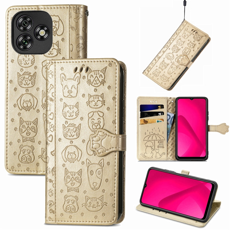 Funda de Piel con Relieve de Gato y Perro para Teléfono Oukitel C53 (Dorada)