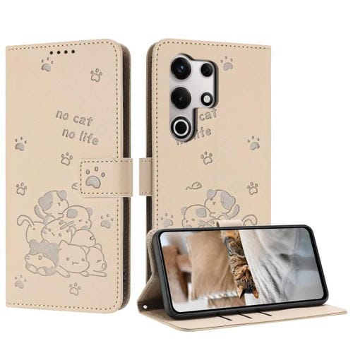 Funda de Cuero Itel S25 Ultra con Diseño de Gatito en Relieve y Cordón (Beige)