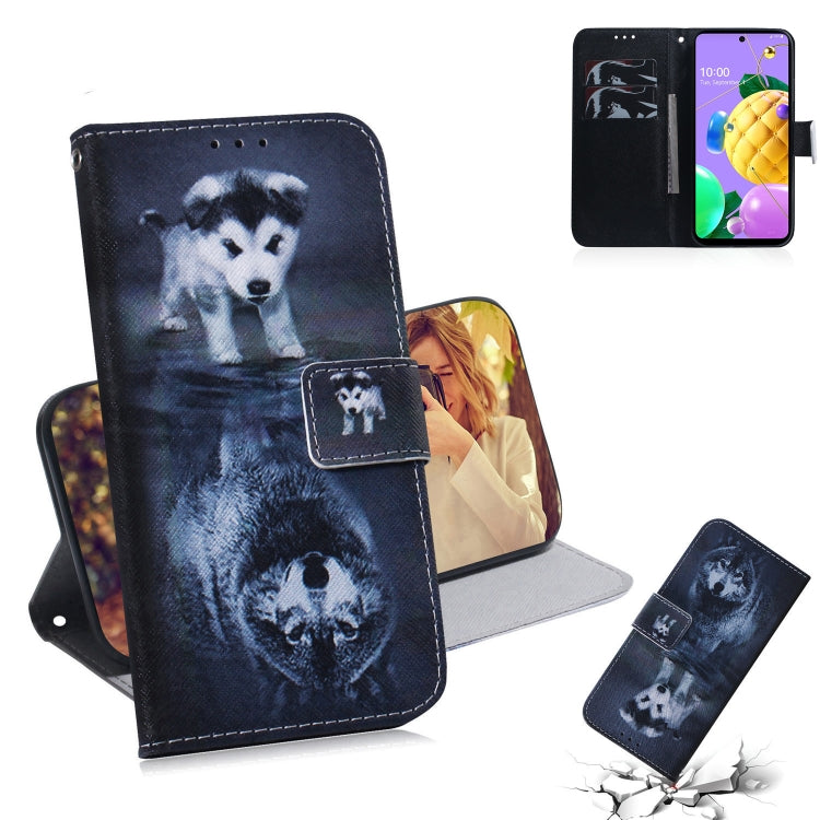 Funda de Cuero Abatible para LG K62 K52 Q52 con Soporte, Ranuras y Billetera (Lobo y Perro)