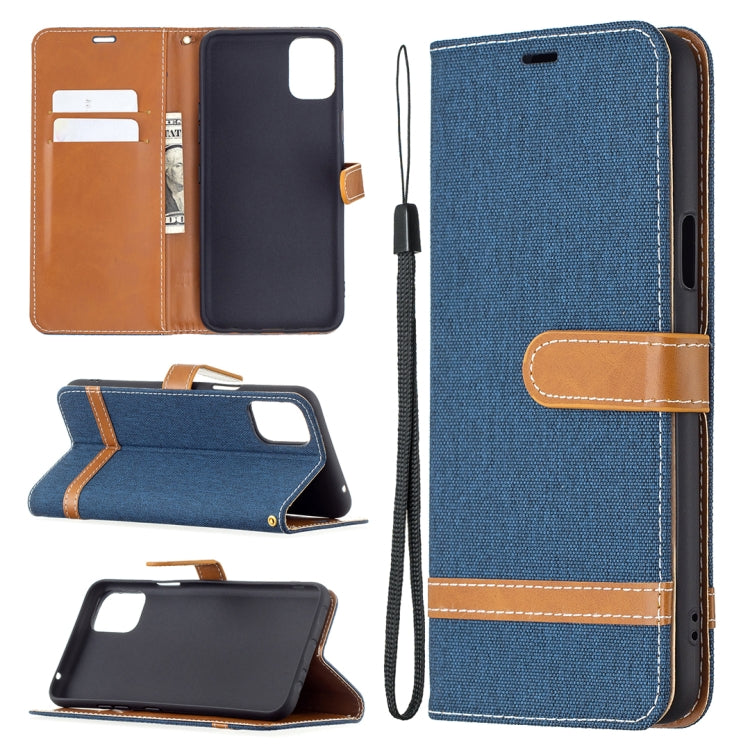 Funda de Cuero para LG K42 con Textura Denim, Soporte, Ranuras para Tarjetas y Cordón (Royal Blue)