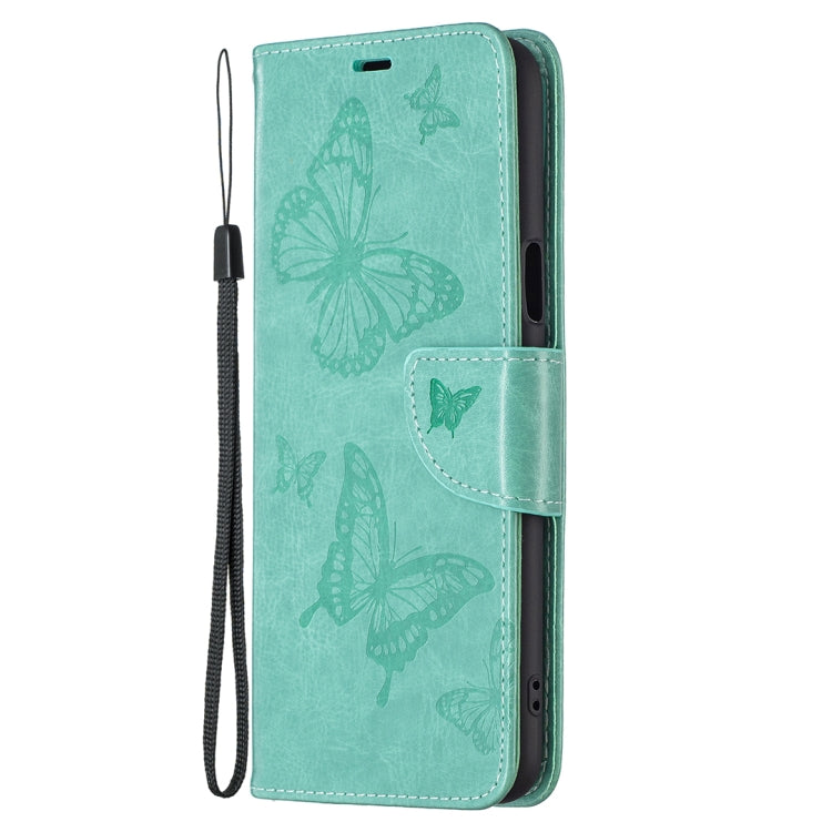 Funda Cuero Horizontal LG K42 Dos Mariposas Estampado en Relieve con Soporte y Ranura (Verde)