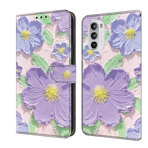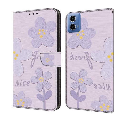Funda de Cuero Pintada al Óleo para Motorola Moto G34 (Flores Moradas)