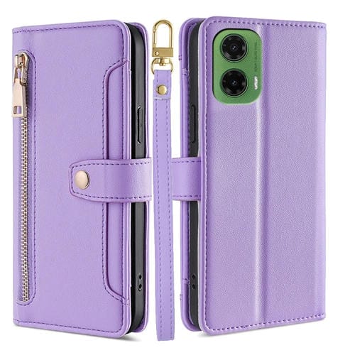 Funda Cuero Tipo Billetera Motorola Moto G35 5G con Cremallera y Textura Oveja (Morado)
