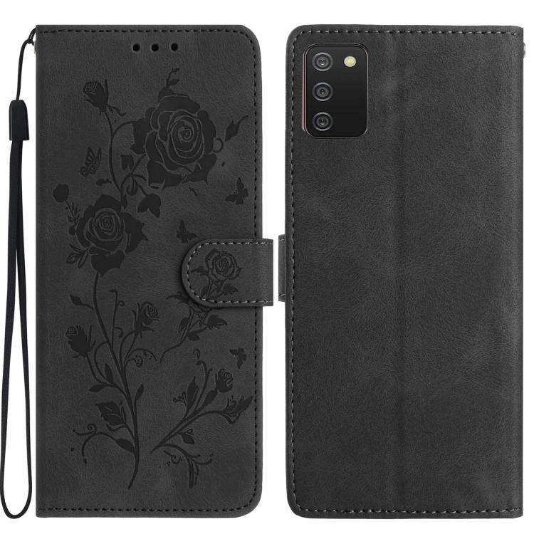 Funda de cuero con estampado de rosas en relieve para Samsung Galaxy A03 (negra)