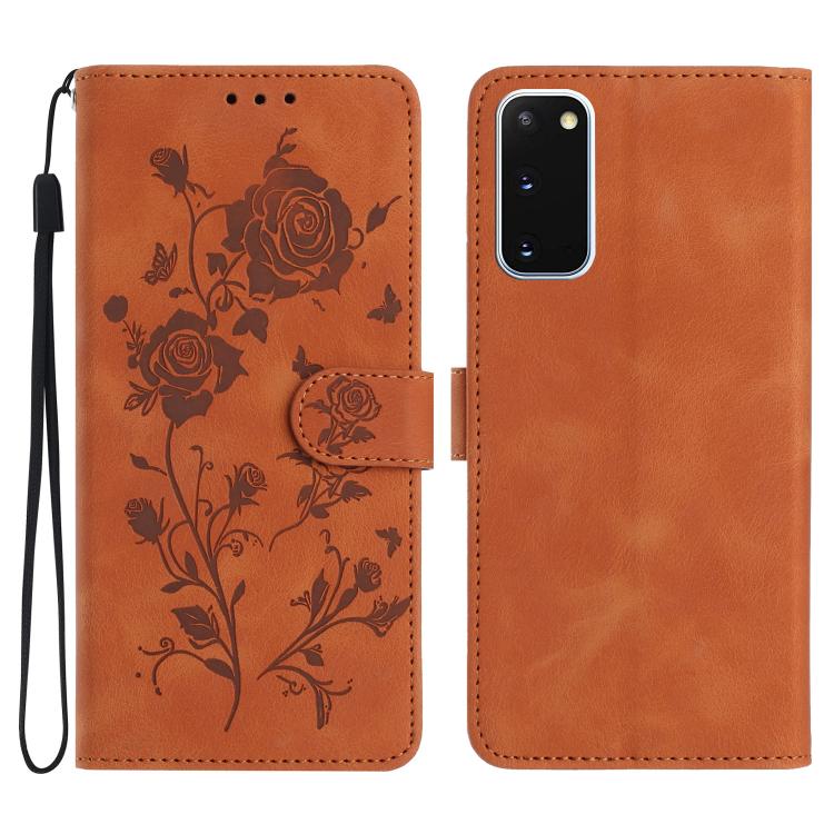 Funda de cuero con estampado de rosas en relieve para Samsung Galaxy S20 5G (marrón)