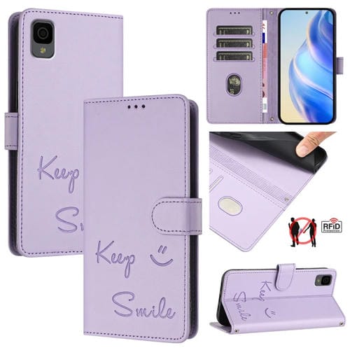 Funda de Cuero Rfid con Relieve Sonriente para TCL 30T T603Dl (Morado Claro)