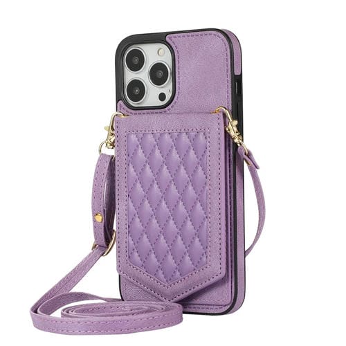 Funda para iPhone 13 Pro Max Rhombic Texture Rfid con Cordón y Espejo (Púrpura)