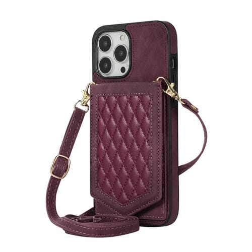 Funda para iPhone 13 Pro Max Rhombic Texture Rfid con Cordón y Espejo (Rojo Vino)