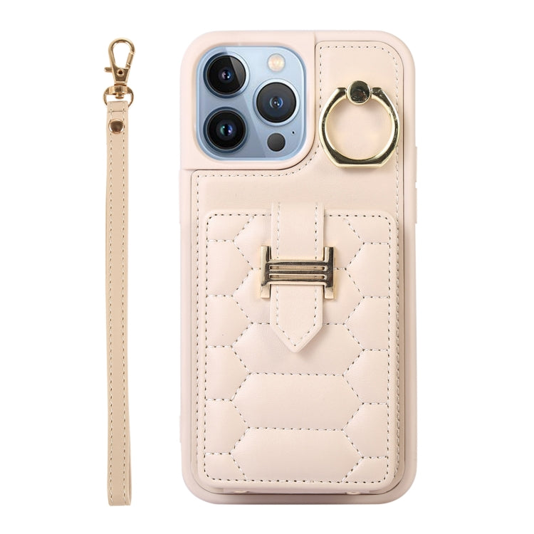 Funda para iPhone 13 Pro Horizontal Card Bag Ring Holder con Doble Cordón (Beige)