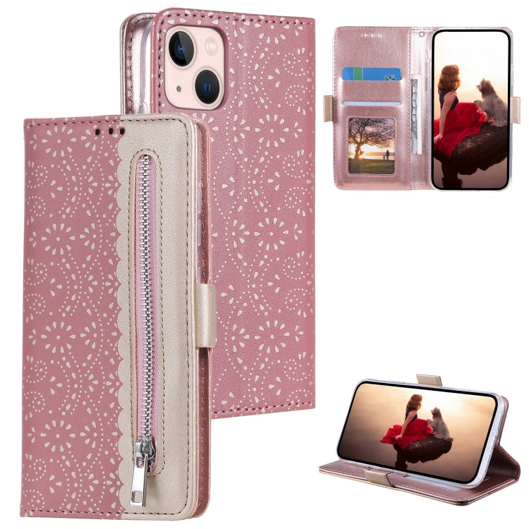 Funda de Cuero para iPhone 15 Plus con Cremallera y Doble Botón Patrón de Encaje y Cordón (Oro Rosa)