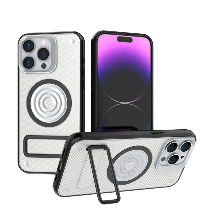 Funda para Teléfono iPhone 15 Pro Max PC + TPU Textura Fibra de Carbono Soporte Metal (Blanco)