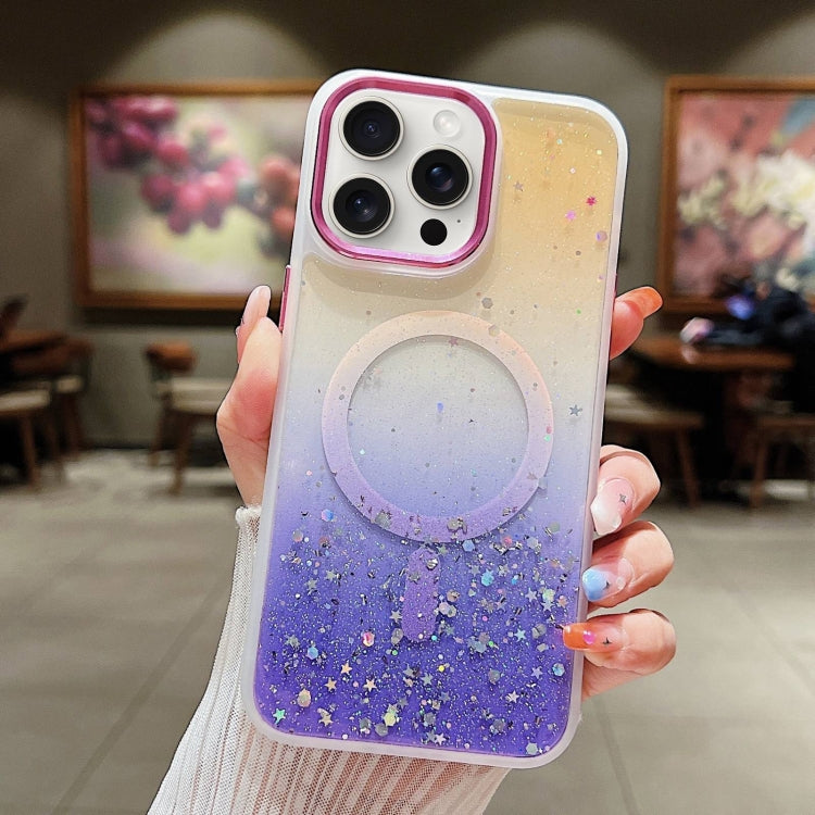 Funda para Teléfono iPhone 15 Pro Max Magsafe TPU con Lentejuelas y Brillo Degradado (Naranja + Morado)