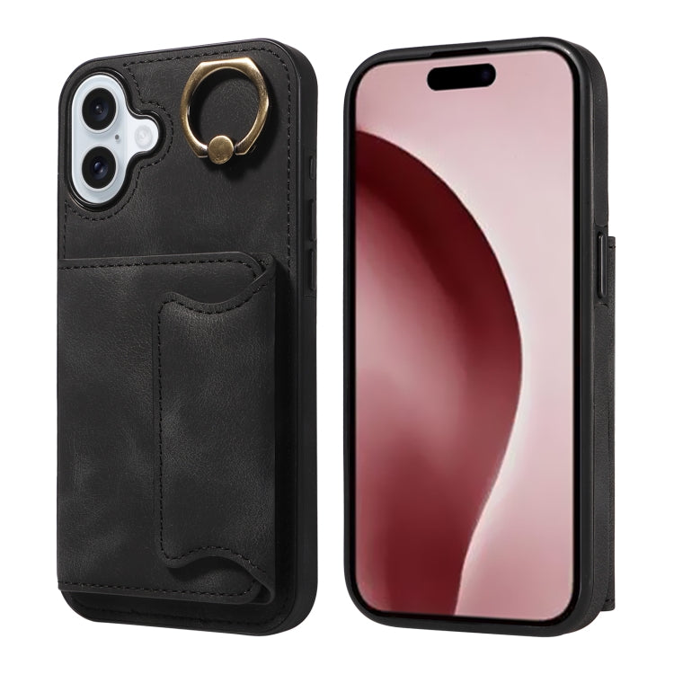 Funda para teléfono iPhone 16 Plus con anillo, tarjetero y asa para colgar (Negra)