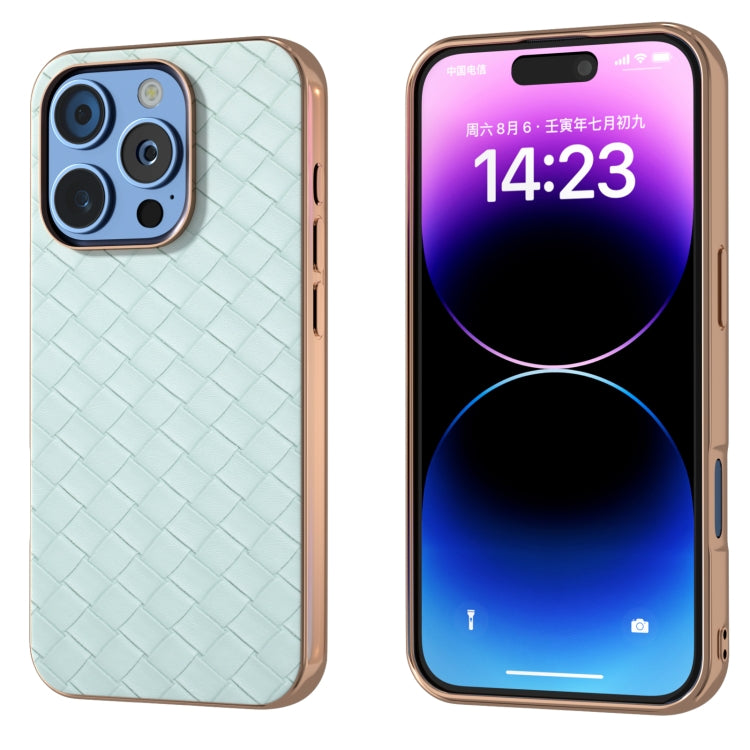 Funda de Teléfono PU con Textura Tejida y Marco Galvanizado para iPhone 16 Pro Max (Verde Claro)