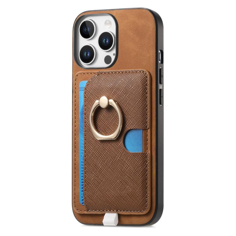 Funda para iPhone 16 Pro Ranuras para Tarjetas Diseño Retro Cruz Anillo Lateral (Marrón)