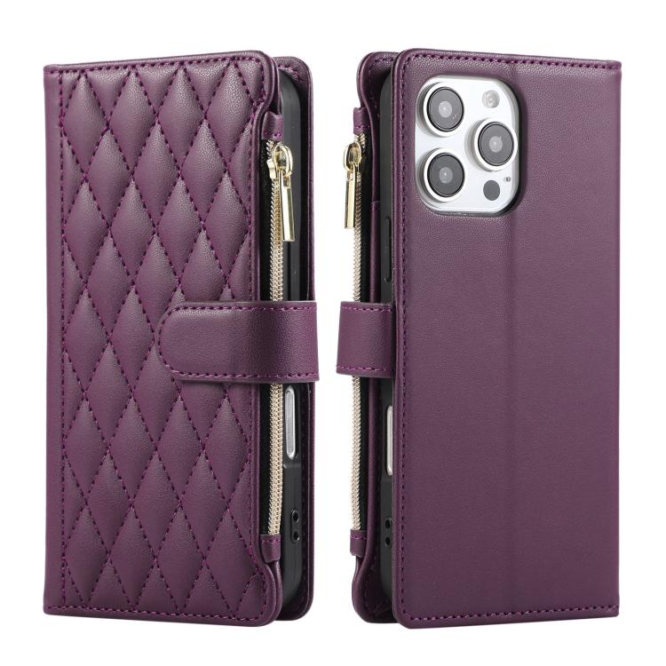 Funda de Cuero Tipo Billetera con Cremallera Rombal para iPhone 16 Pro (Morado Oscuro)