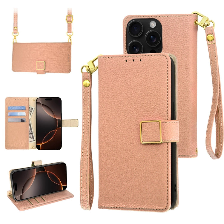 Funda de Cuero Apple iPhone 16 Pro con Hebilla Cuadrada y Textura de Lichi (Oro Rosa)