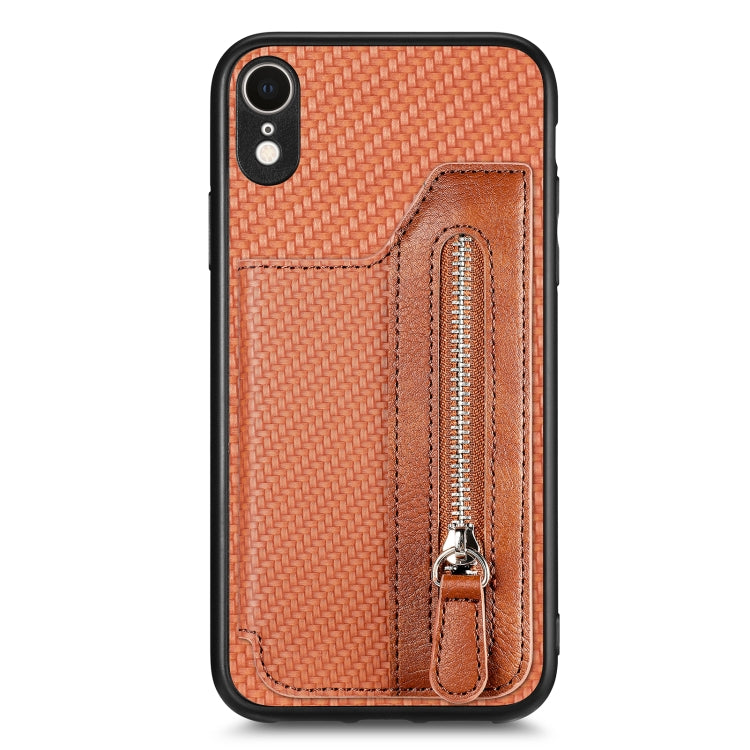 Estuche para teléfono iPhone Xr con billetera cremallera tapa horizontal fibra de carbono (Marrón)