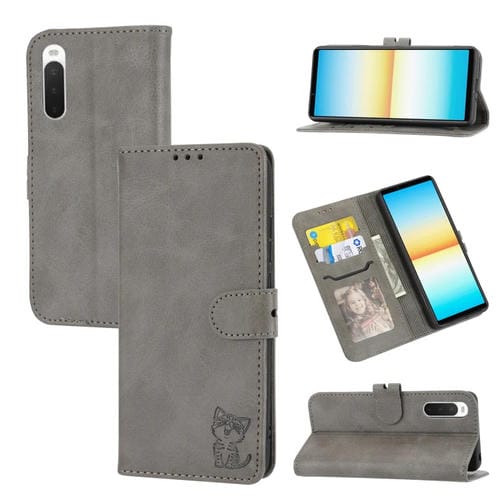 Estuche de Cuero para Sony Xperia 10 Iv con Patrón de Gato Feliz en Relieve (Gris)